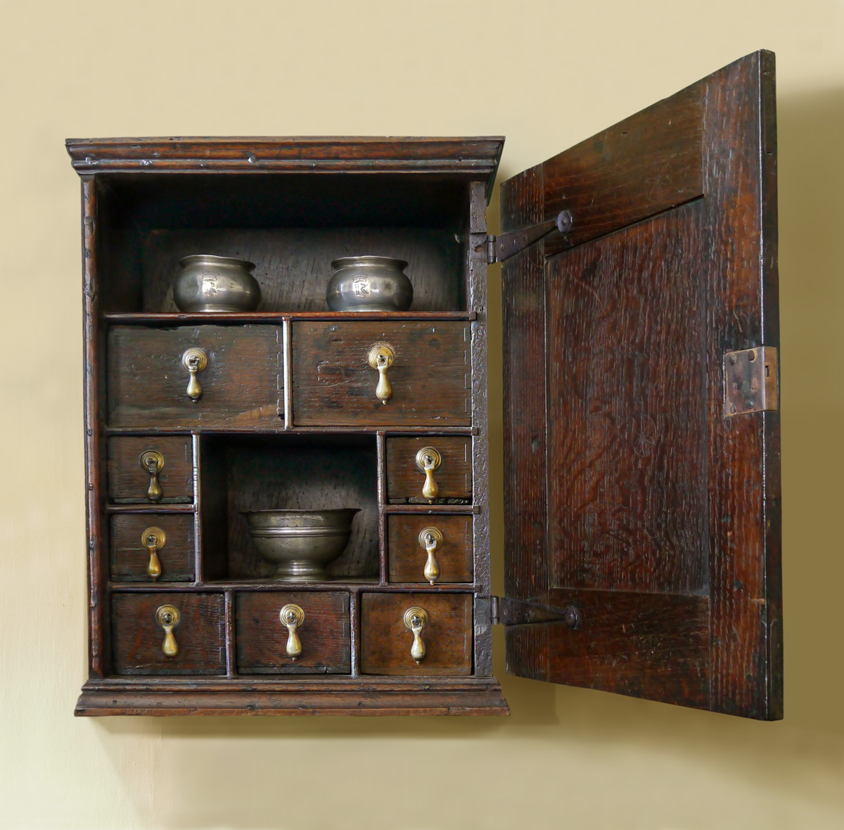 The door opens to reveal a fitted interior of 9 small drawers, all with their original brass pulls, set around a central compartment which would have housed a bronze mortar to grind the spices stored in the drawers. The full-length horizontal compartment at the top would have stored the pestle for use with the mortar, and possibly pewter bowls to mix the spices.