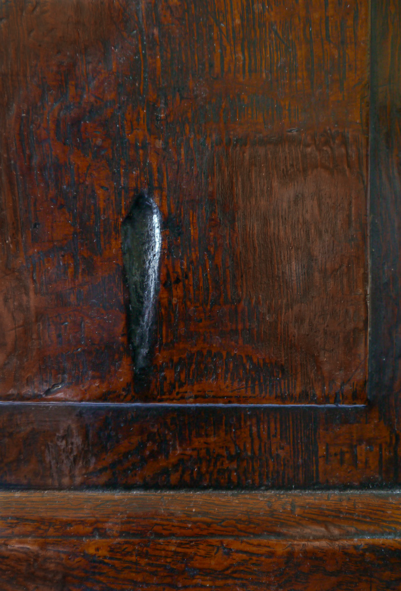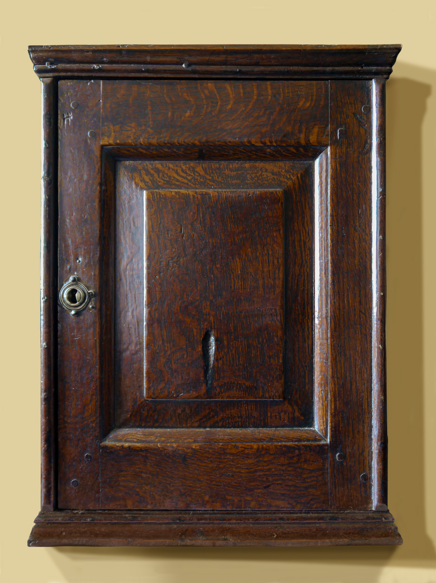 The front, formed as a single door, with a raised panel set into a morticed and tenoned frame, which retains the original lock, escutcheon and strap hinges, with "penny" ends.