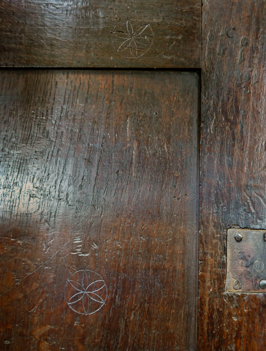 Most interestingly are the "witches circles" scratched into the inside of the cupboard door, and the deep tadpole-shaped burn to the front of the door, which it was thought would warn off evil spirits, which could put curses on the food (it was thought the evil spirit would rest on the circle and then become confused as it followed the trail round and round, and couldn't get off).