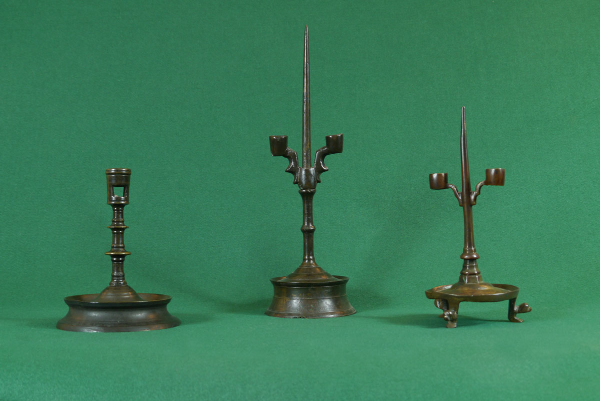 This beautifully patinated candlestick has a tall central pricket, with a ring-turned base, upon which sits the twin nozzles. The stepped base is decorated with narrow ring-turnings and a shallow rim for catching spent wax.